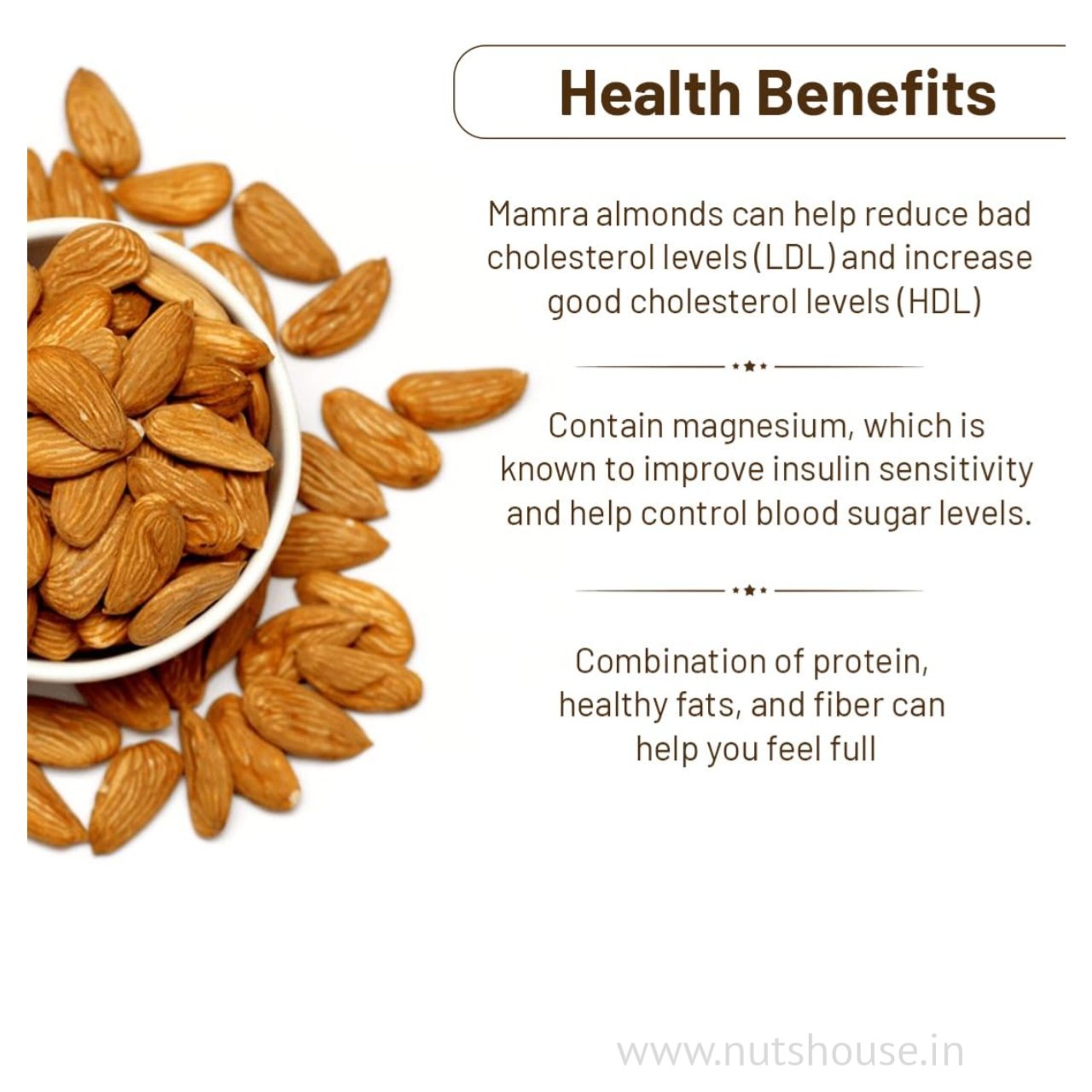 Mamra almonds are a good source of monounsaturated fatty acids, vitamin E, copper, and protein. Mamra almonds contain a good amount of manganese, vitamin B6, folic acid, magnesium, and iron. Studies have shown that this helps lower LDL cholesterol and triglyceride levels while improving HDL (good) cholesterol levels.